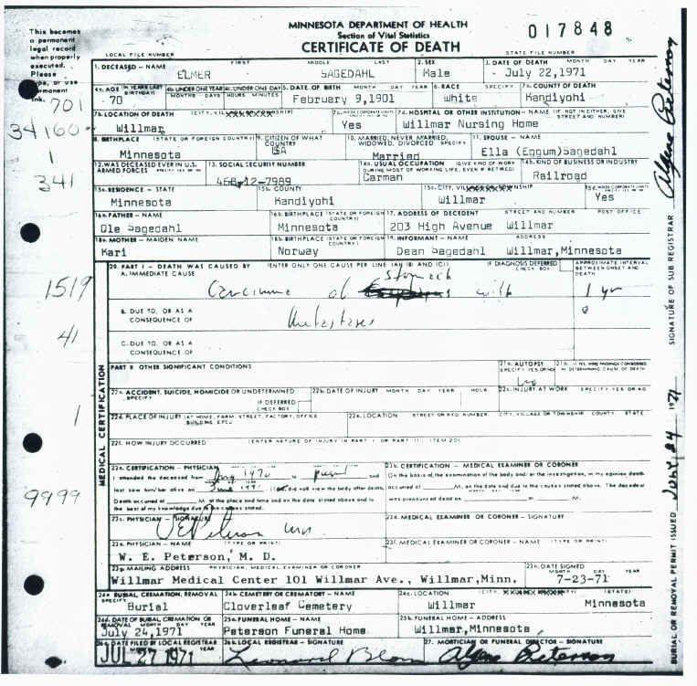 Death Record - Elmer Sagedahl