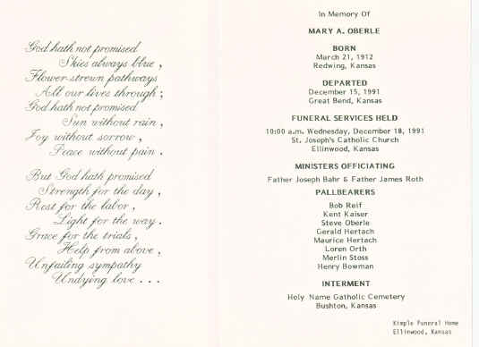 Mary Oberle Funeral Card